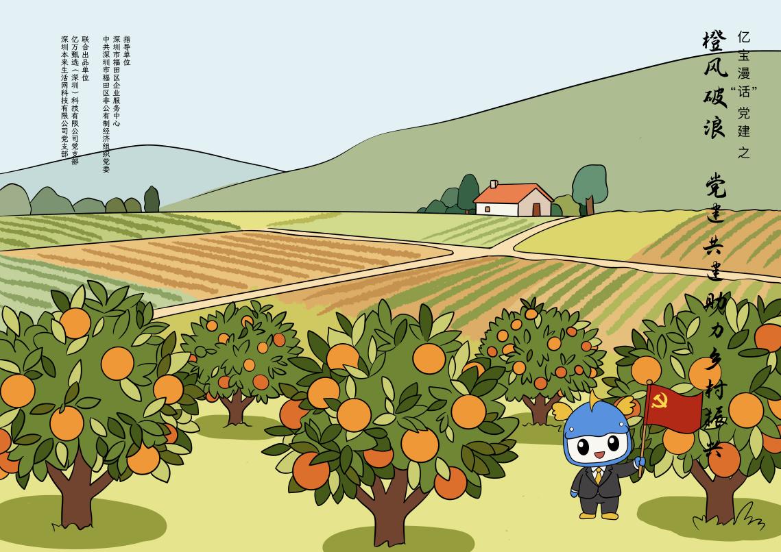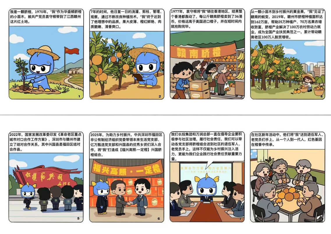 为深入贯彻落实乡村振兴战略,积极响应福田区对口合作工作部署,亿万甄选党支部以党建为引领,主动与福田非公党委携手,共同开展“福兴高照一定橙”产销联动活动。活动聚焦福田区重点对口合作县——江西赣州兴国县的乡村发展需求,精准对接当地农业产业资源。在产品包装中,亿万甄选党支部以其生动温暖的画笔,通过一幅幅插画,讲述了兴国作为著名“将军县”的红色底蕴、果农们辛勤耕耘的丰收喜悦,以及深赣两地携手助农的深厚情谊。它将一份淳朴的农产品提升为承载着两地情谊与公益初心的文化礼品,随盒送达千家万户,极大地增强了此次助农行动的情感温度与文化感染力,让每一次消费都成为一次直接的爱心帮扶。
