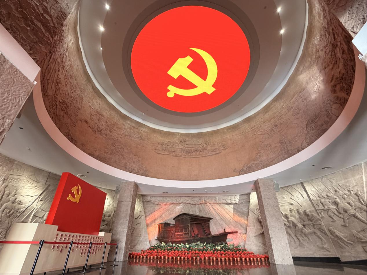 随后我们来到了南湖革命纪念馆,建筑上的党徽在阳光下熠熠生辉。走进纪念馆,便可见南湖红船的浮雕,我们依次参观了“救亡图存”“开天辟地”“光辉历程”和“走向复兴”四个展厅,仿佛翻开了一本厚重的党史书卷。馆内陈列了大量珍贵的历史文物和图片资料,泛黄的文献、陈旧的照片、复原的会议场景,生动地展现了中国共产党从诞生到发展壮大的光辉历程。站在“开天辟地”展厅内,党员们不时交流心得,分享对历史细节的感悟,有同志说到:“我仿佛能听到革命先辈们坚定的誓言和激昂的呐喊。”