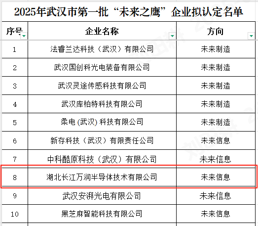 近日,武汉市经济和信息化局对2025年第一批“未来之鹰”企业拟认定名单完成公示,万润科技旗下湖北长江万润半导体技术有限公司经过规范的企业申报、推荐和集中评审流程,成功入选。