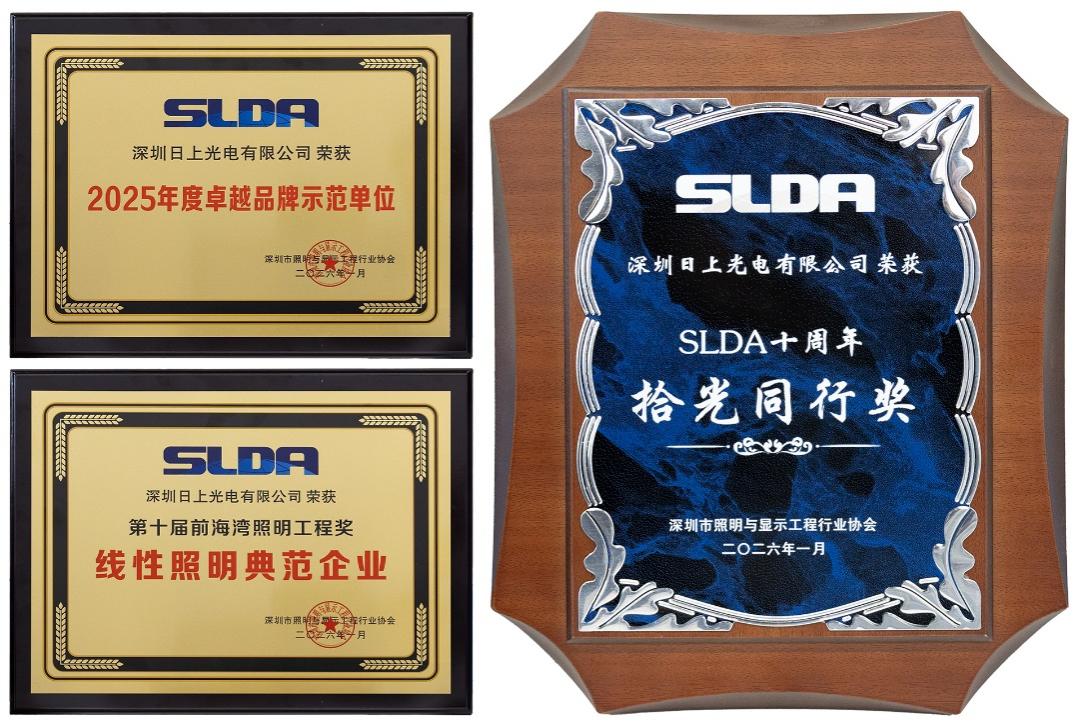 2026年1月6日,深圳市照明与显示工程行业协会(SLDA)成立十周年年会在深圳隆重举行。行业专家、高校学者、企业家及企业代表、国际照明行业学者共聚一堂,共见SLDA十年峥嵘岁月,共话照明行业发展新篇章。SLDA,成立于2016年,是专业且具有显著产业影响力的行业组织,也是推动照明技术创新和产业发展的重要力量。此次会上,SLDA对优秀单位及个人颁发荣誉。日上光电凭借其在照明领域卓越品牌影响与技术创新,荣获“年度卓越品牌示范单位”、“线性照明典范企业”、“拾光同行奖”多项荣誉。