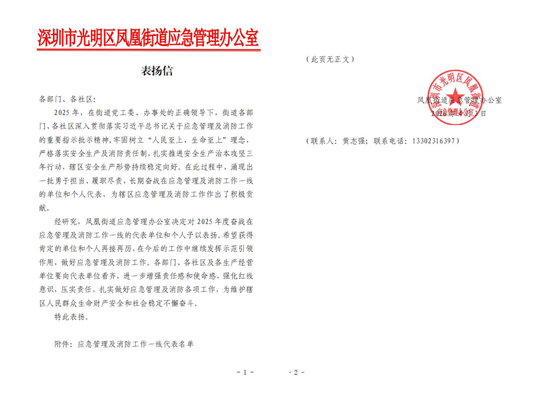 近日,万润科技旗下深圳日上光电有限公司收到深圳市光明区凤凰街道应急管理办公室发来的表扬信,对其在辖区应急管理及消防工作中做出的积极贡献表示认可。