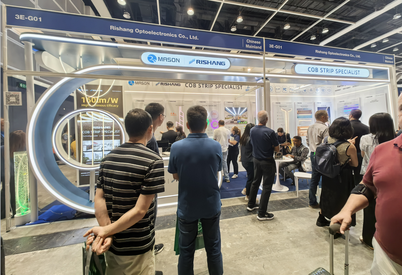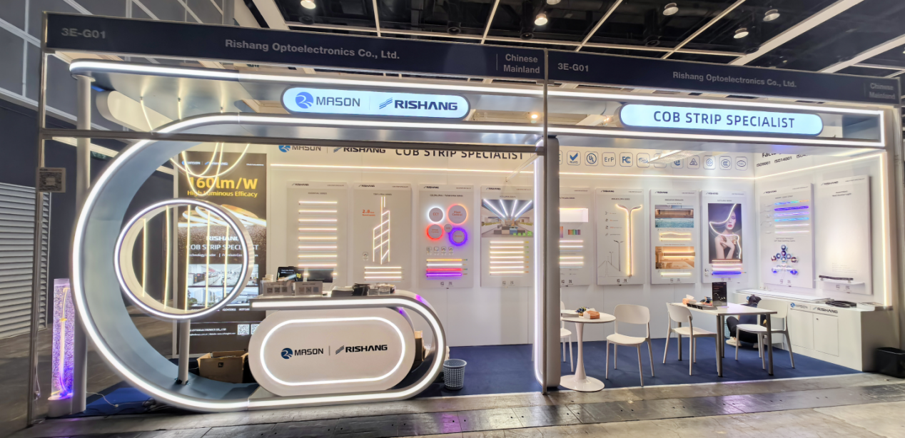 日上光电在本次展会中,创新采用“微场景”形式展示多款兼具美学设计与技术突破的灯带新品,受到与会专业观众的广泛关注。展品包括刷新行业高光效标准160lm/W的COB灯带、精准应对狭窄空间照明需求的2.8mm极窄COB灯带、专为严苛环境打造的IP68泳池灯带与耐120°高温桑拿灯带,全面展现公司在特殊照明场景下的技术积累与产品化能力。