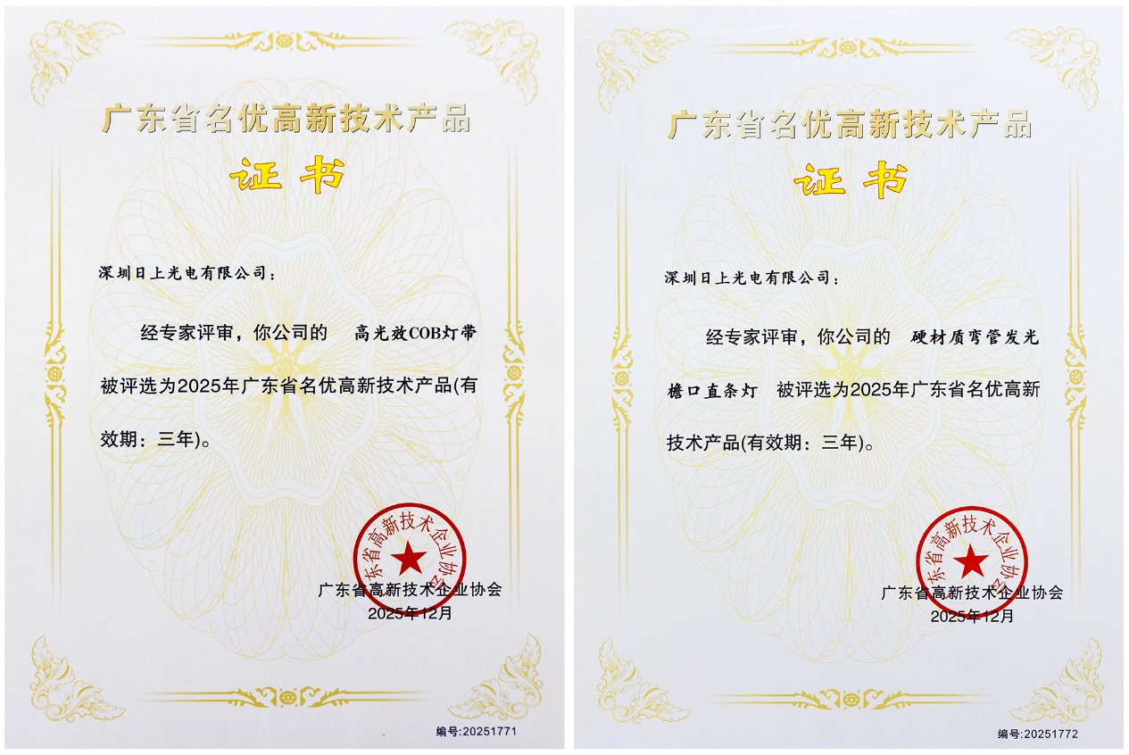 在粤港澳大湾区科技创新浪潮中,广东省名优高新技术产品认证犹如一面“金字招牌”,成为企业技术实力与市场价值的双重背书。近日,日上光电凭借其自主研发的高光效COB灯带和硬管檐口直条灯,成功斩获双殊荣,不仅彰显了企业在LED照明领域的领军地位,更以创新技术重新定义了照明行业的品质标杆。