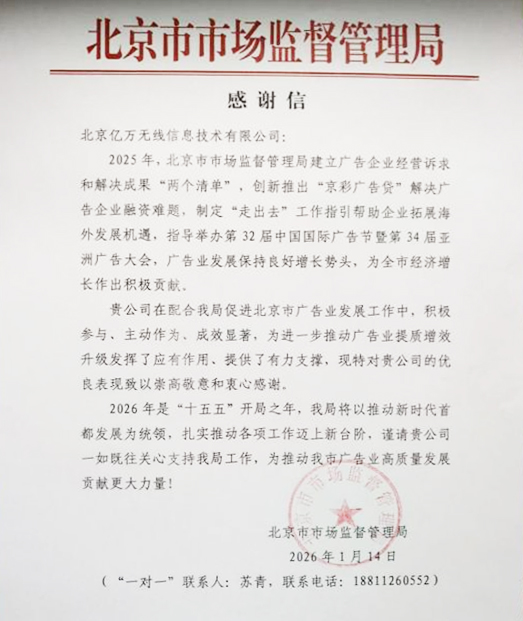 此次获得官方致信感谢,不仅是对亿万无线过去一年工作的认可,也标志着公司在推动行业创新与服务升级方面取得了阶段性成果。未来,亿万无线将继续在集团与总部的带领和支持下,发挥技术与服务优势,深化与政府部门及行业各界的合作,积极参与行业标准建设与市场拓展,推动首都广告业向更高质量、更广阔的空间发展。